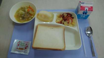 けいにくとてぼまめのスープに、じゃがいもとトマトのチーズやき、なし、しょくパン、りんごジャム、牛乳