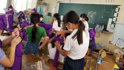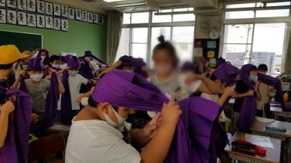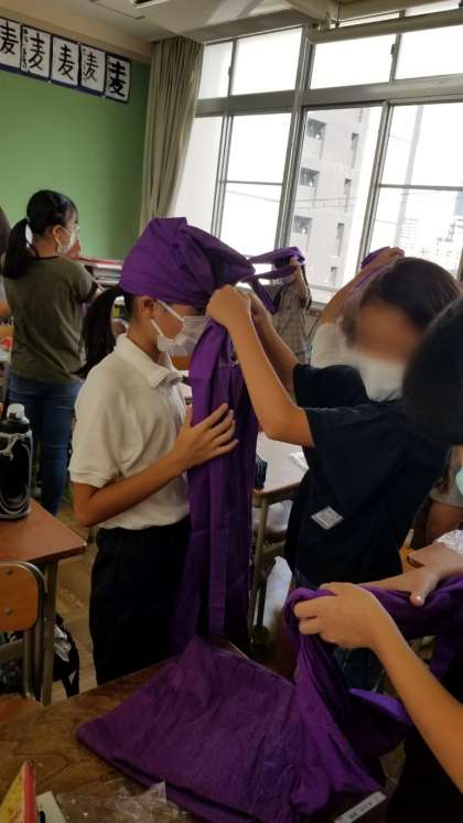 エイサーの時、頭につけるサージの巻き方を6年生が4年組の教室に教えにに来てくれました。