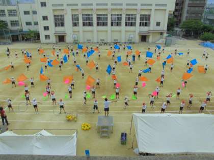 5年生と6年生が力を合わせて演技をします。旗やフラフープ、ボールを自由自在に使いこなし、隊形変化も高学年らしく見事です。運動会当日がとても楽しみです。