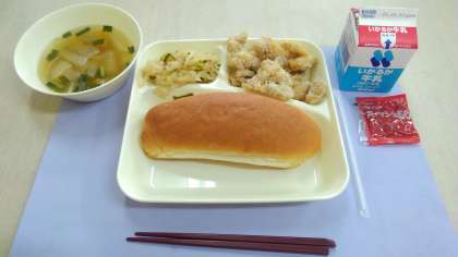 けいにくのからあけ、とうがんのちゅうかスープ、きりぼしだいこんのごまからみづけ、コッペパン、いちごジャム、牛乳