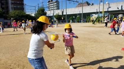 バドミントンラケットにボールをはさみ、ふれあい班でリレーをします。