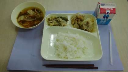 けいにくのゆずしおやき、ソーキじる、もやしとさんどまめのあまずあえ、ごはん、牛乳