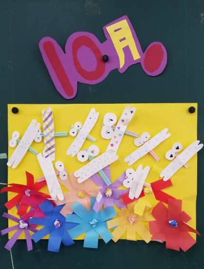 掲示係は背面黒板に季節に合った掲示物を作り、行事予定を書いてくれます。