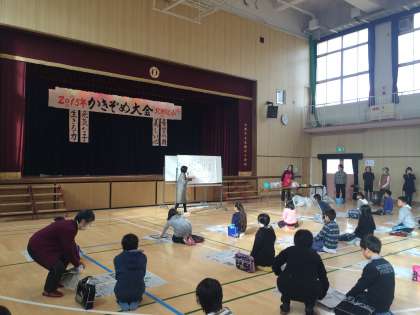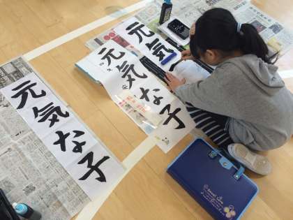 講師の関岡先生に指導していただき、3年生は「生きる力」4年生は「元気な子」を書きました。