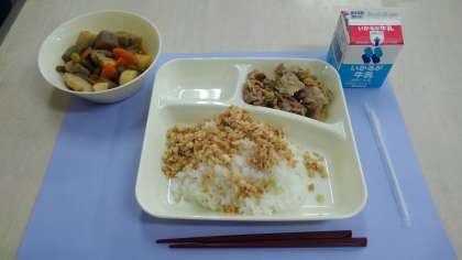 ぶたにくのねぎじょうゆやき、ふきよせに、ツナだいずそぼろ、ごはん、牛乳