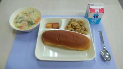 はくさいのクリームに、あつあげのピリからじょうゆかけ、ぶたにくとれんこんのオイスターソースいため、こくとうパン、牛乳