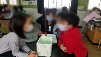 理科の学習では、水も温度が変わると体積が変わるかの実験をしました。