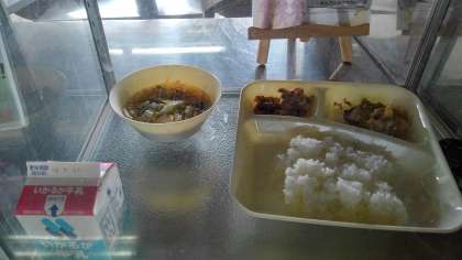 ぶたにくのねぎじょうゆやき、すましじる、れんこんのおかかいため、ごはん、牛乳
