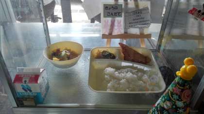 たらのフライ、ぶたにくとあつあげのにもの、もやしときゅうりのおひたし、ごはん、牛乳