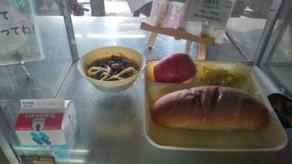 カレーうどん、はくさいのおひたし、りんご、こくとうパン、牛乳