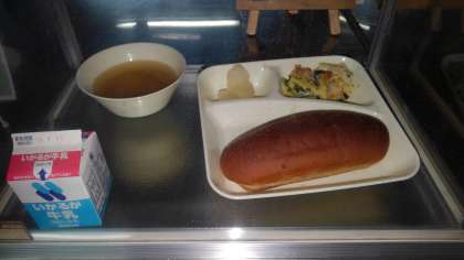 ほたてがいのグラタン、スープ、わなしのかんづめ、こくとうパン、牛乳