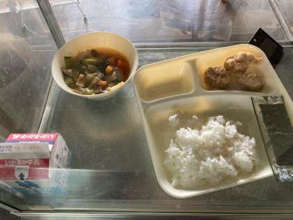けいにくのからあげ、まるてんとやさいのうまに、やきのり、ごはん、牛乳