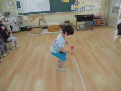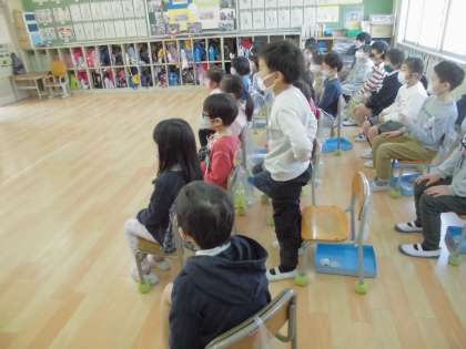お世話になった先生を招いて、けん玉、こま回し、英語など小学生になってできるようになったことを発表しました。最後は、全員で元気よく歌を歌いました。