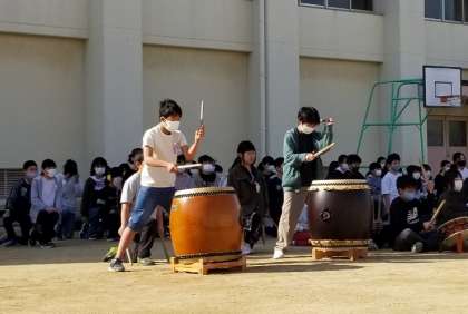 6年生からは、手作りぞうきんと和太鼓演奏のプレゼントがありました。
