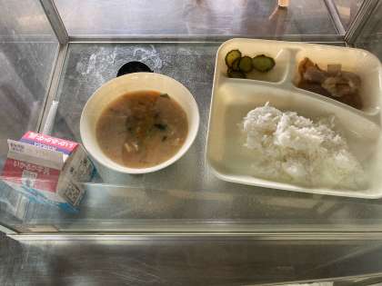 やきとり、みそしる、きゅうりのゆずふうみ、ごはん、牛乳
