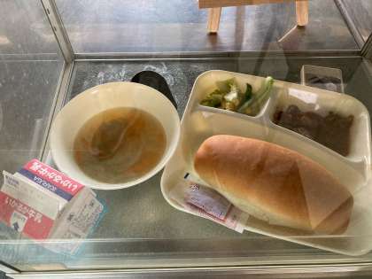 ぶたにくのデミグラスソース、スープ、キャベツとコーンのソテー、コッペパン、いちごジャム、牛乳