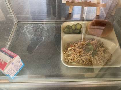 やきそば、きゅうりのしょうがづけ、こくとうパン、牛乳