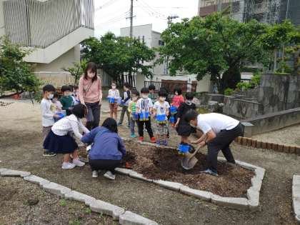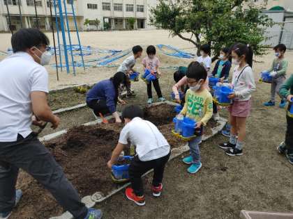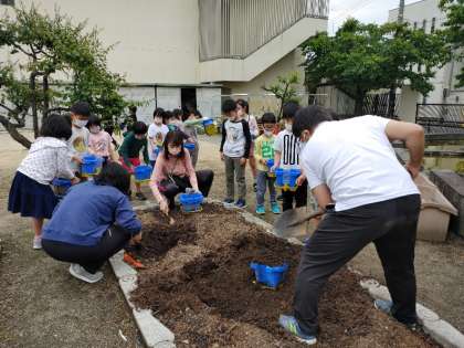 2年生がサツマイモ植えに備えて、学習園の畑作りの準備をしました。