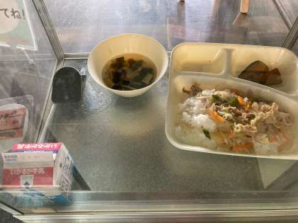 ぶたどんぶり、ゆばのすましじる、かぼちゃのしょうゆやき、牛乳
