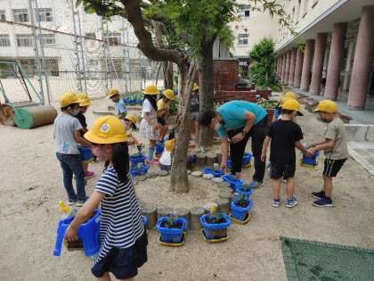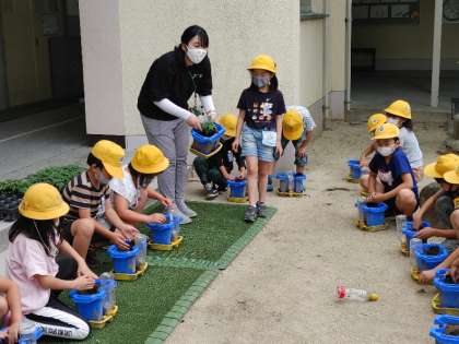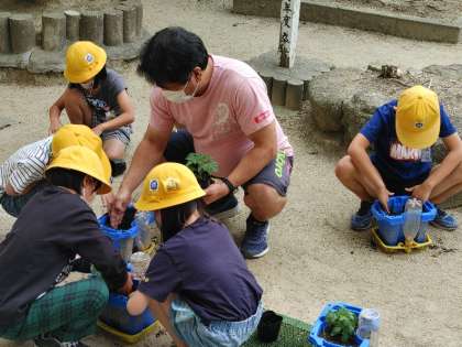 一人一鉢でミニトマトの苗を植えました。植木鉢の土に苗を植えるため、穴を掘ります。