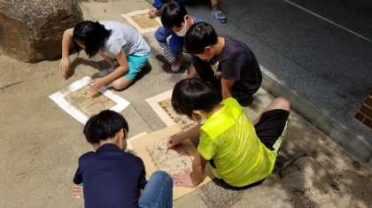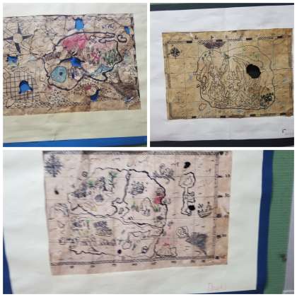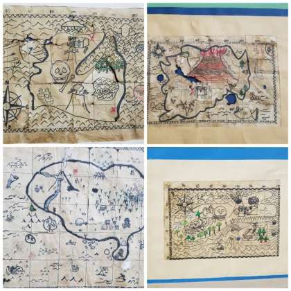 まず、油性ペンで絵を描き、クレヨンて色をつけました。次に、コーヒー染めをしました。