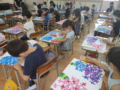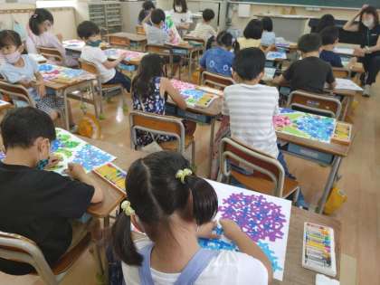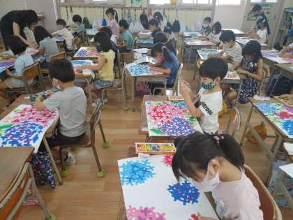 1年生が図画工作科の学習で、真剣に画用紙に向かっています。