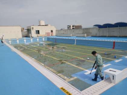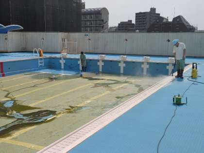 朝から水を抜いて、屋上プールの清掃が開始されました。
