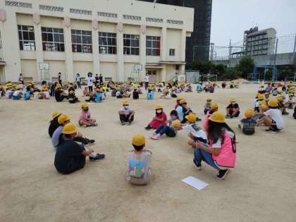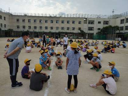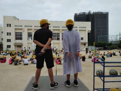運動場で、今年度最初の集会委員会による児童集会がありました。