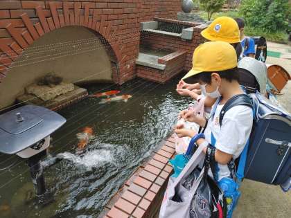 放課後の池では、恒例の「鯉の餌やり」が始まりました。