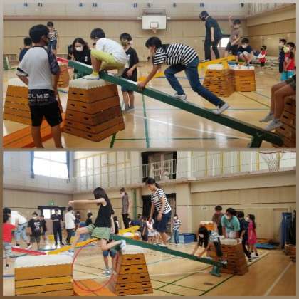 運動委員会による、「忍」で、体力アップにチャレンジ。年々レベルアップのアスレチックに子どもたちは大喜びで取り組みました。