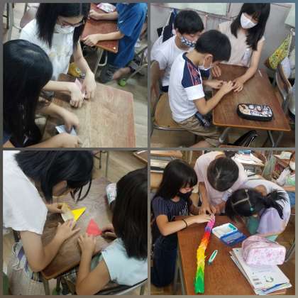 田辺模擬原爆慰霊祭に向けての千羽鶴作りに向けて、折り鶴の折り方を、ふれあい班のペアの3年生に教えに行きました。