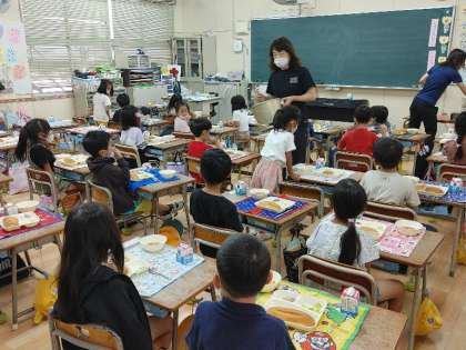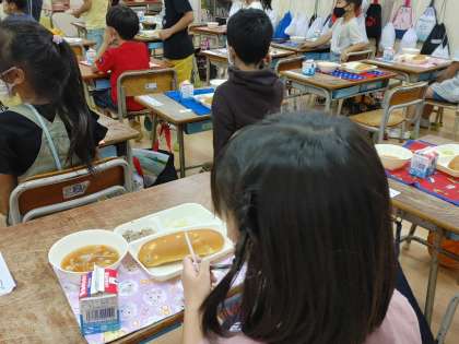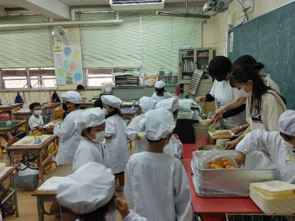 当番が給食室まで食器や牛乳、おかずとパンを取りに行きます。