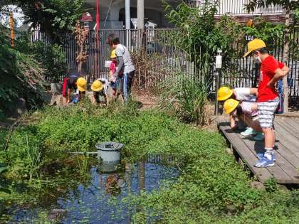 最後は、ビオトープ池や岩石園や学習園で、生物の環境しらべです。