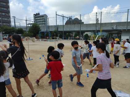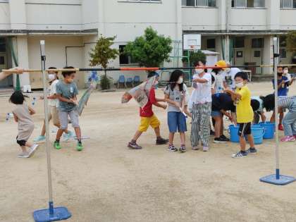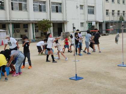 4年2組が運動場で実験をしています。