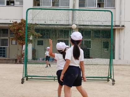 ソフトボール投げは、防球ネットを前に置いて、それを越える角度で投げる練習をしていました。