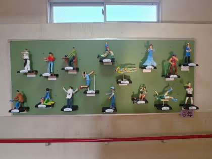 6年生の教室前のロッカーの上や階段廊下の掲示板に、図画工作の作品が展示されています。