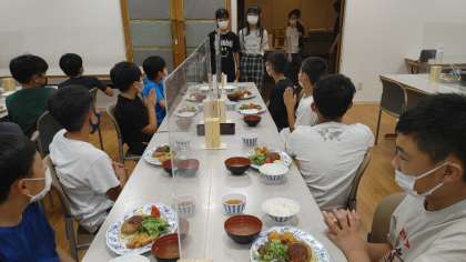 献立は、ハンバーグ、スパゲッティ、唐揚げ、ポテトサラダ、サニーレタス、玉ねぎスープ、ご飯でした。