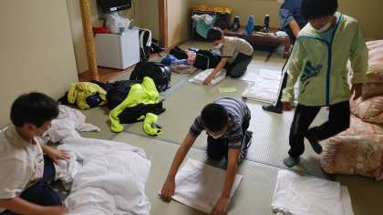 その後、生活班で協力して、布団を整理し、部屋の片付けです。