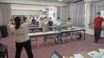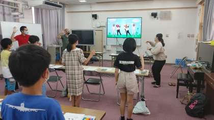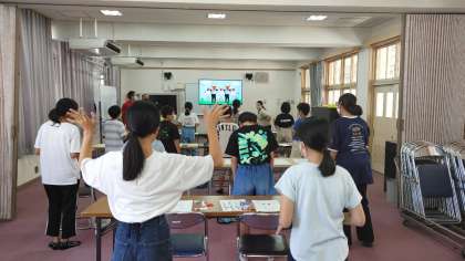 集会室に集まった児童は、C NETの先生と英語で会話したり、ダンスを楽しみました。