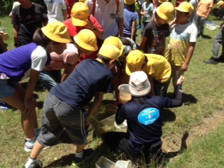 野外では、自然の中にコウノトリをすぐそばで見ることができました。大きなビオトープで生き物の観察もしました。大阪にはいないヌマガエルも見ました。