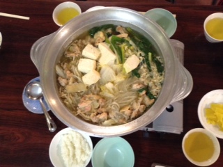 二日目の夕食の献立は、鶏鍋です。あっさりとした味のスープですが、鶏肉がたくさん入っていて、チキンスープの出汁がしっかり効いていて、みんなのお箸も超スピードで進みます。