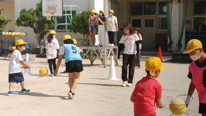 二人で、バドミントンラケットを使ってボールを運びます。リレー形式で競走しました。