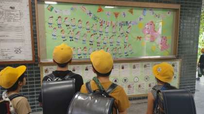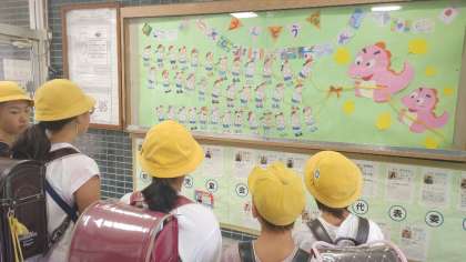 運動会をテーマに、恐竜と3年生が綱引きをしている様子です。