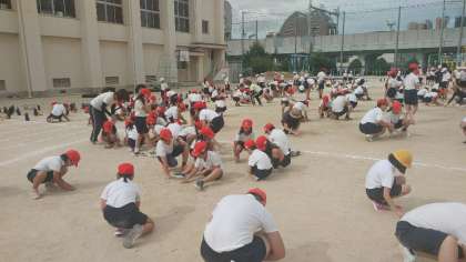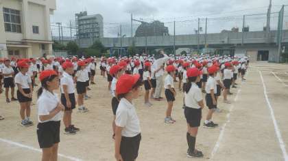 全学年が運動場に集合し、開会式と閉会式の流れをつかみました。
