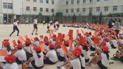 応援団の指示に従って、全児童で手拍子、掛け声やウエーブを行います。
