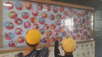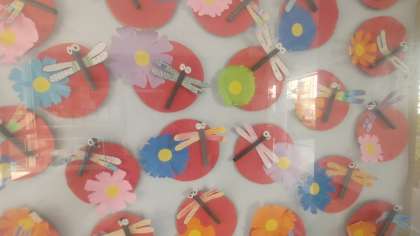 「コスモスの花とトンボ」をテーマに2年生が制作しました。