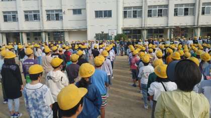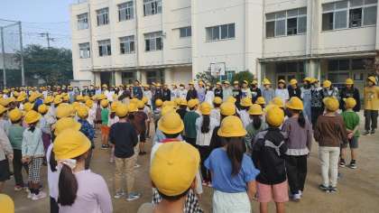 雲ひとつない秋晴れの運動場で児童朝会がありました。