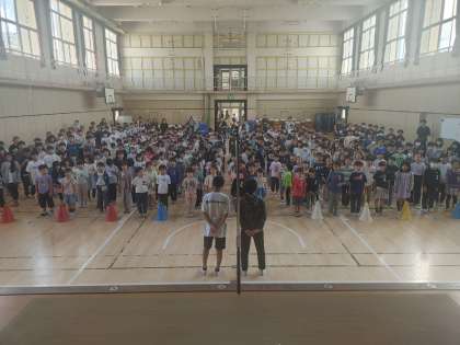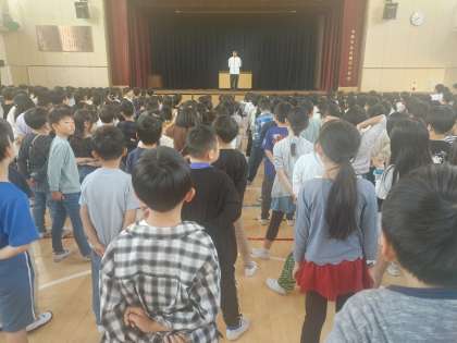 児童朝会は運動場やオンライン(教室)で実施することもあります。