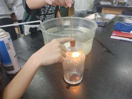 それぞれの気体をびんに取り出し、その中で火のついたろうそくの燃え方を比べて調べます。