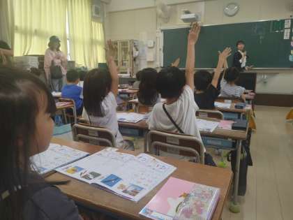 児童は、たくさんの保護者の方に囲まれて緊張した中で、手をピンとまっすぐ挙げていました。